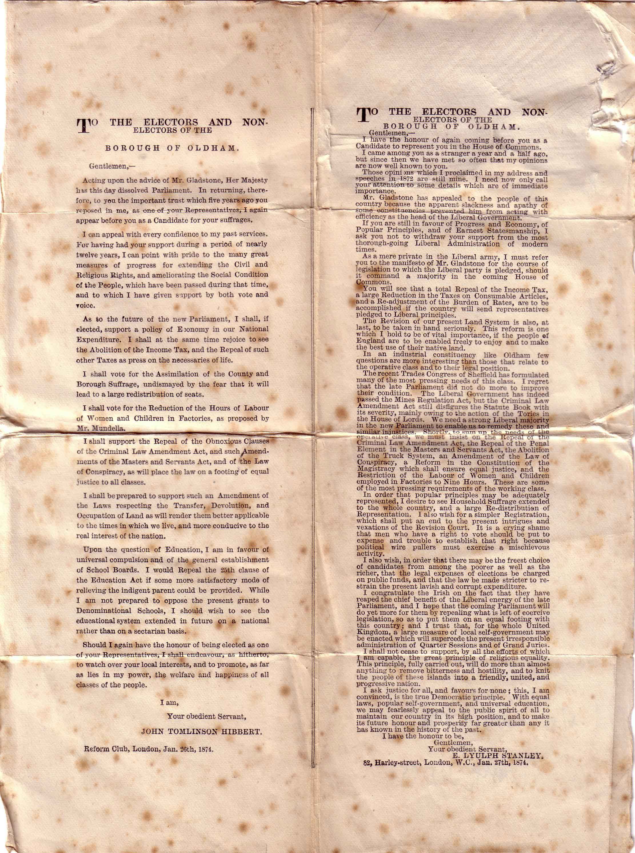 Our MP of the Month, John Tomlinson Hibbert, was among those Liberal backbenchers who took a keen interest in the reform debates and played a prominent part in shaping the measure. Returned as MP for his native Oldham at a by-election in May 1862, he was re-elected in 1865 alongside his fellow Liberal, John Platt. As well as their shared political views, Hibbert was connected to the Platts through business: his father had founded Oldham’s largest engineering firm with Platt’s father in 1822, although by 1854 the Platts had bought out the Hibbert interest. Instead of following in his father’s footsteps, Hibbert qualified as a barrister. Although he did not practise as a lawyer, his legal training proved a valuable asset in his parliamentary career, and John Stuart Mill praised him as ‘rather clever as well as careful in framing amendments’ to legislation. He was also linked to the Platts by marriage: John’s younger brother James, another Liberal MP, who was killed in tragic circumstances in 1857, had married Hibbert’s sister-in-law.