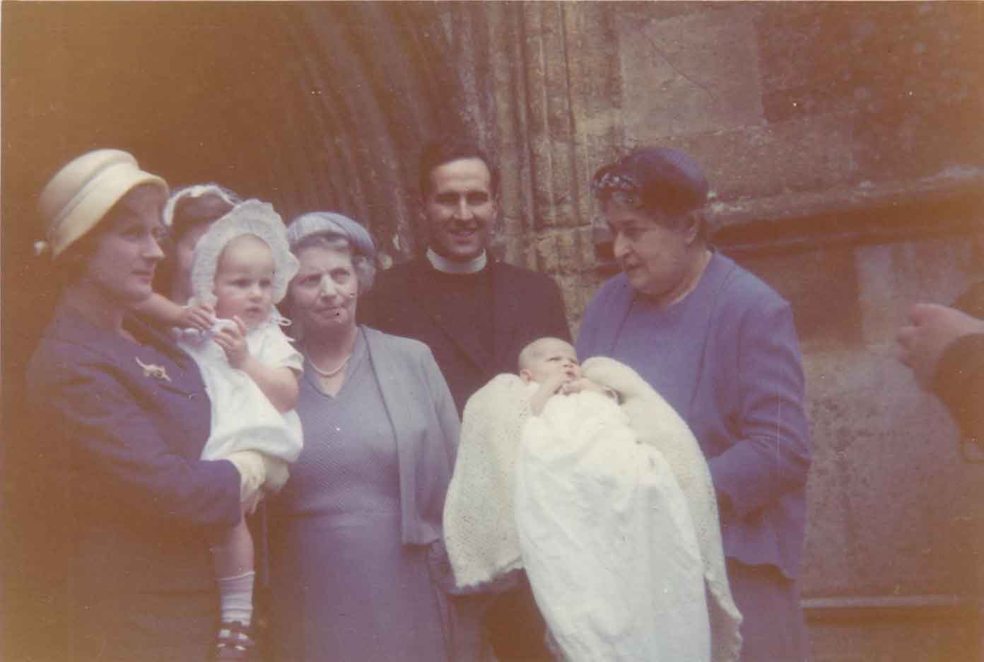 Valery Fraser, Clare Jeans, Beatrice Jane Bailey, Reverend Richard Jeans and Daisy Dorothy Levens holding Bridget Mary Jeans b.1959